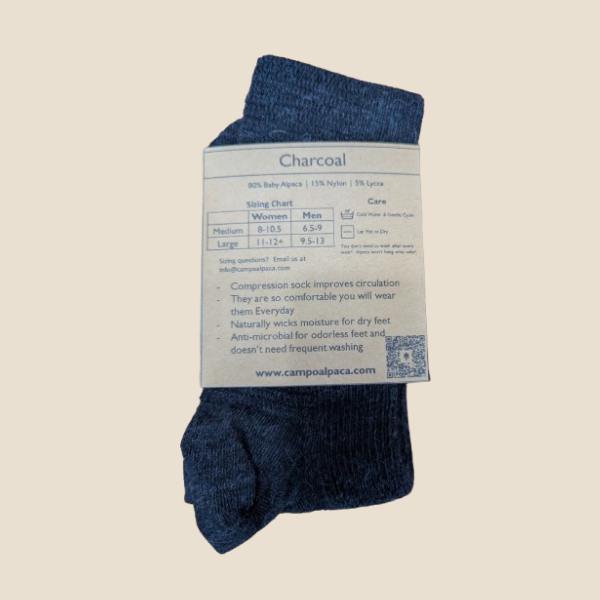 Made from soft, breathable alpaca fiber, they naturally regulate temperature, keeping your feet warm in cold weather, cool in heat, and dry all day. Durable yet cozy, they provide the benefits of compression without sacrificing comfort.